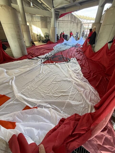 それも、オープニングのフラッグベアラーという、大きなフラッグをセンターサークルで広げるという大役までやらせてもらいました。
