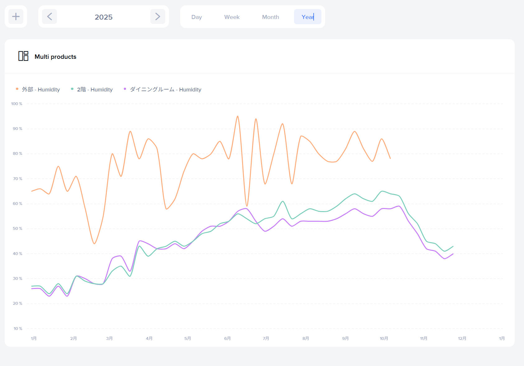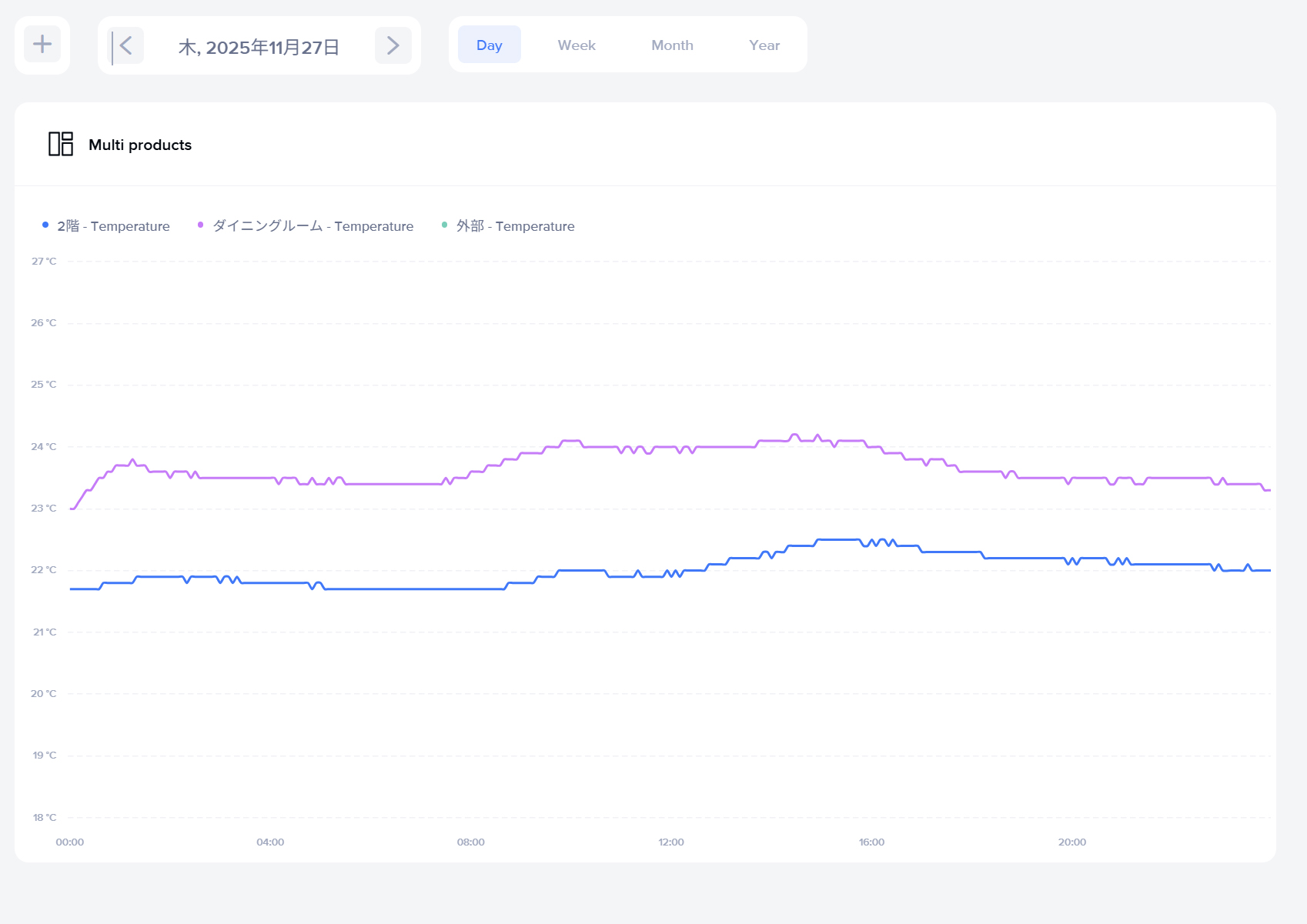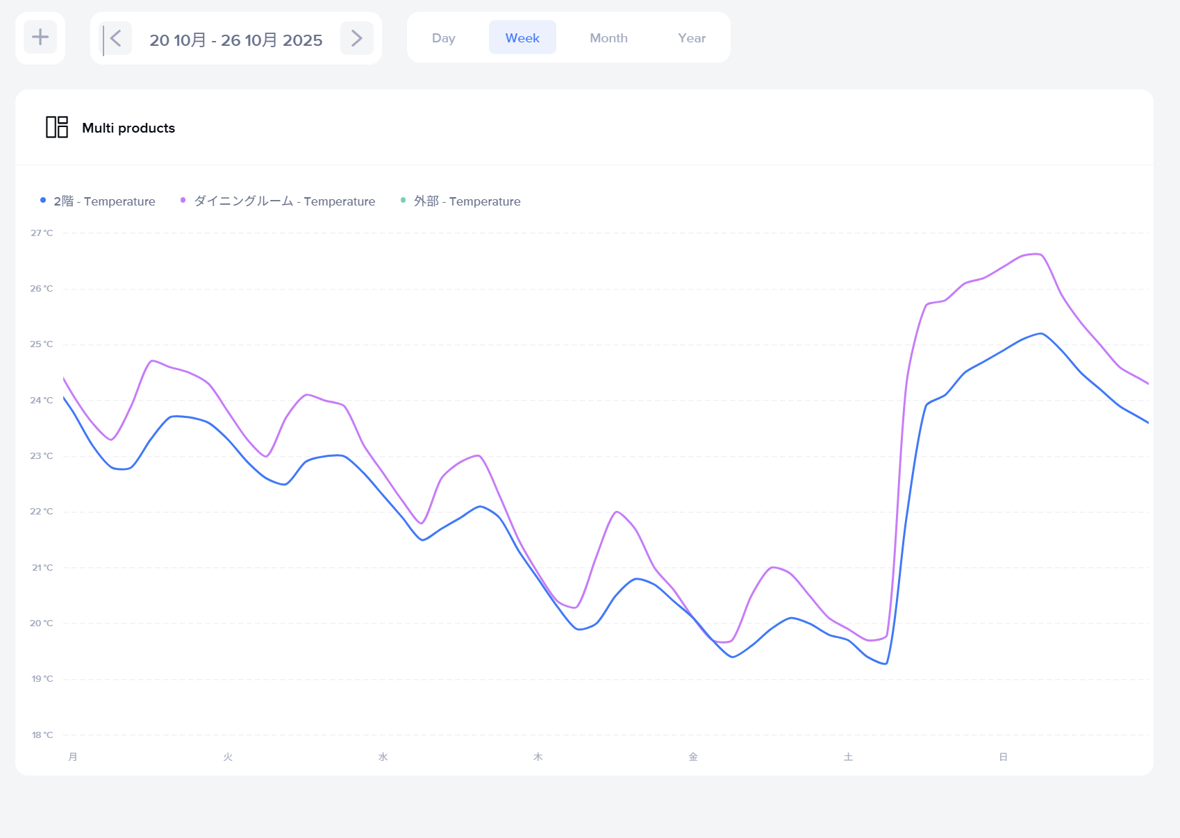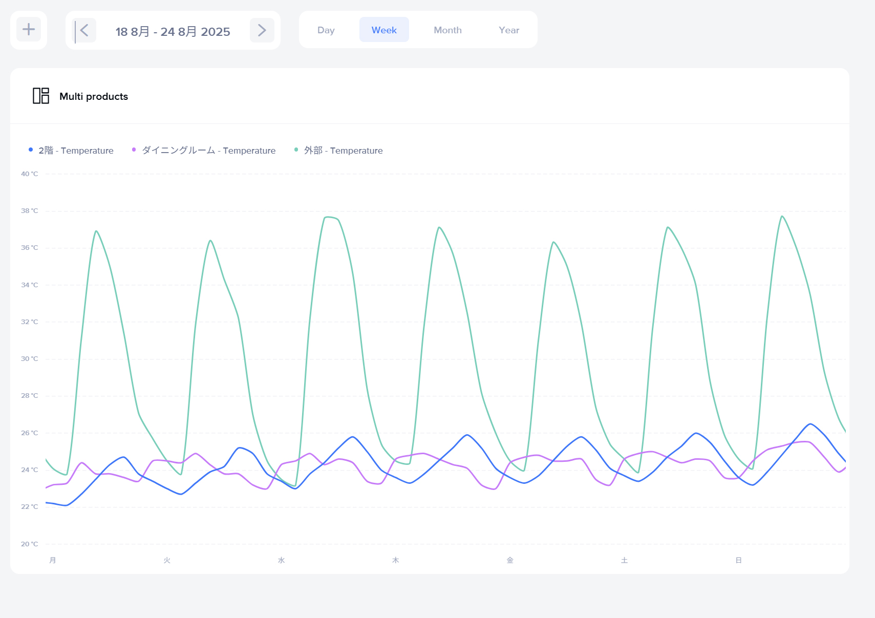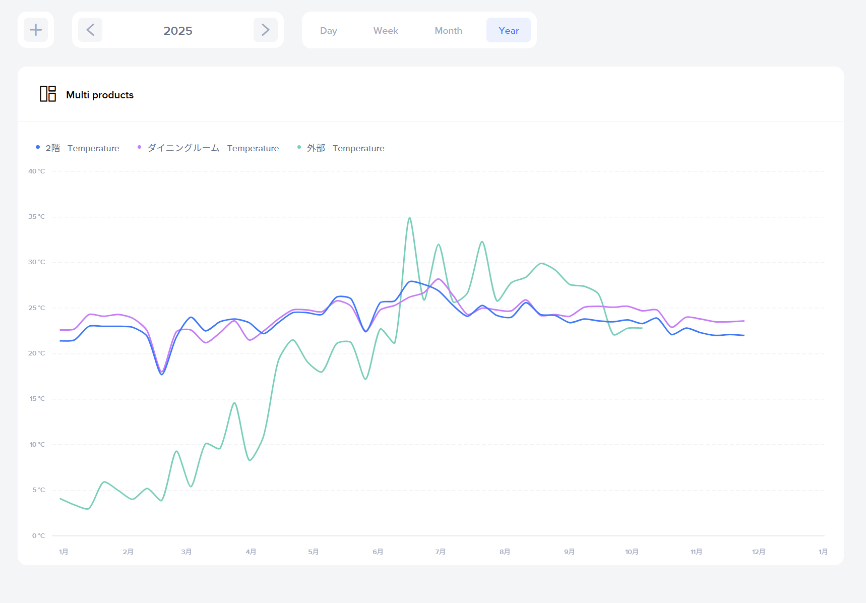 グリーンは外部気温、ブルーは1階ダイニング、パープルが2階クローゼットのラインです。