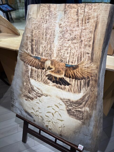 銘木板に半田ゴテのよう器具を使って描かれたアート作品