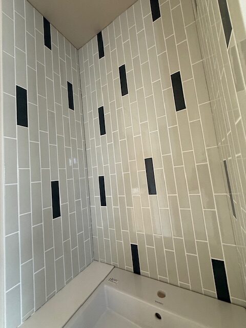 やわらかなホワイトを基調に、縦に走るブラックのアクセントタイルが空間を引き締め、清潔感の中にさりげない個性を添えています。シンプルでありながら単調にならず、訪れるたびに心地よい印象を感じられるデザインです。