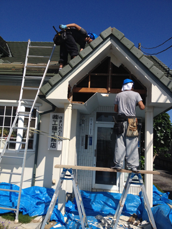 今週は玄関の屋根工事のみですが、15日から全面駐車場の解体が始まり本格的な改修工事が