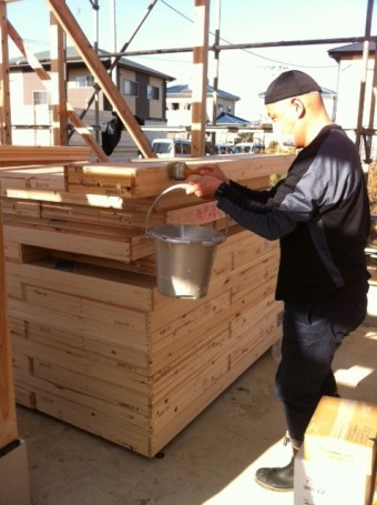 構造材には吹付の機械で施工していきます。