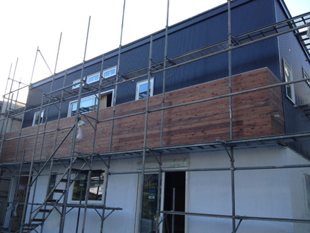 上部のガルバリウム鋼板張りは完了、下部は漆喰なんですが、中塗り工事まで完了