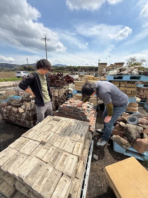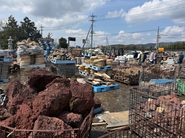 現地に到着すると、タイル置き場倉庫、外構で使う建材や石材がずらり。