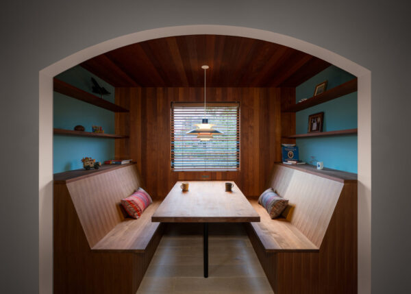 一方ダイニングは、包まれるような居心地のよい設えとし、食事や会話をゆったりと楽しめる場所となっています。