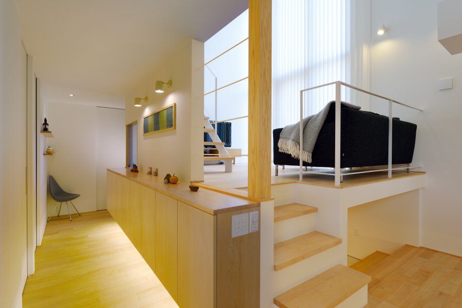 閑静な住宅街に佇むalice オーナー様とのお手伝いは土地の選定でありました。いくつかの候補から、この土地に決めたのは、住宅街の中でも木々が見える場所であり、オーナー様の家のイメージと一致したからです。住宅街ということもあり、目線がきになるのでくつろぐリビングはスキップフロアで上に上げることによって、おおきな窓の連窓でもあるカーテンウォールを設置しても、道路からの目線を合わないようにしました。外部はガルバリウム鋼板ですが、佐野氏の庭木と外観がマッチングしており、デザインの高い外観でも柔らかく感じます。