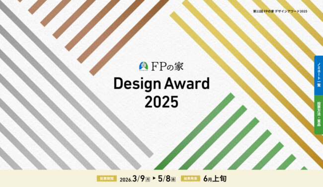2026.03.20 お知らせ FPの家 DesignAward2025 開催中 「FPの家 デザインアワード」は、全国のFPの家工務店が施工した住宅の中から、 デザイン性に優れた住まいを一般投票で選ぶイベントです。 投票してくださった方には、豪華賞品もございます。 是非、お気に入りのお家を選んでいただけたらと思います。 みなさんの投票お待ちしております。 特設サイトはコチラ